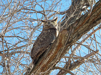From there, south on Pleasant Valley Road. (I don't think I've ever gone far enough, to get to the Pleasant Valley.) But a detour on a favorite... Ten Mile Creek Road. (More scenic on July 14, than on January 14.) However... I spotted a tree. And in that tree, I spotted an owl! (Great Horned Owl, I presume. We looked each other over.)